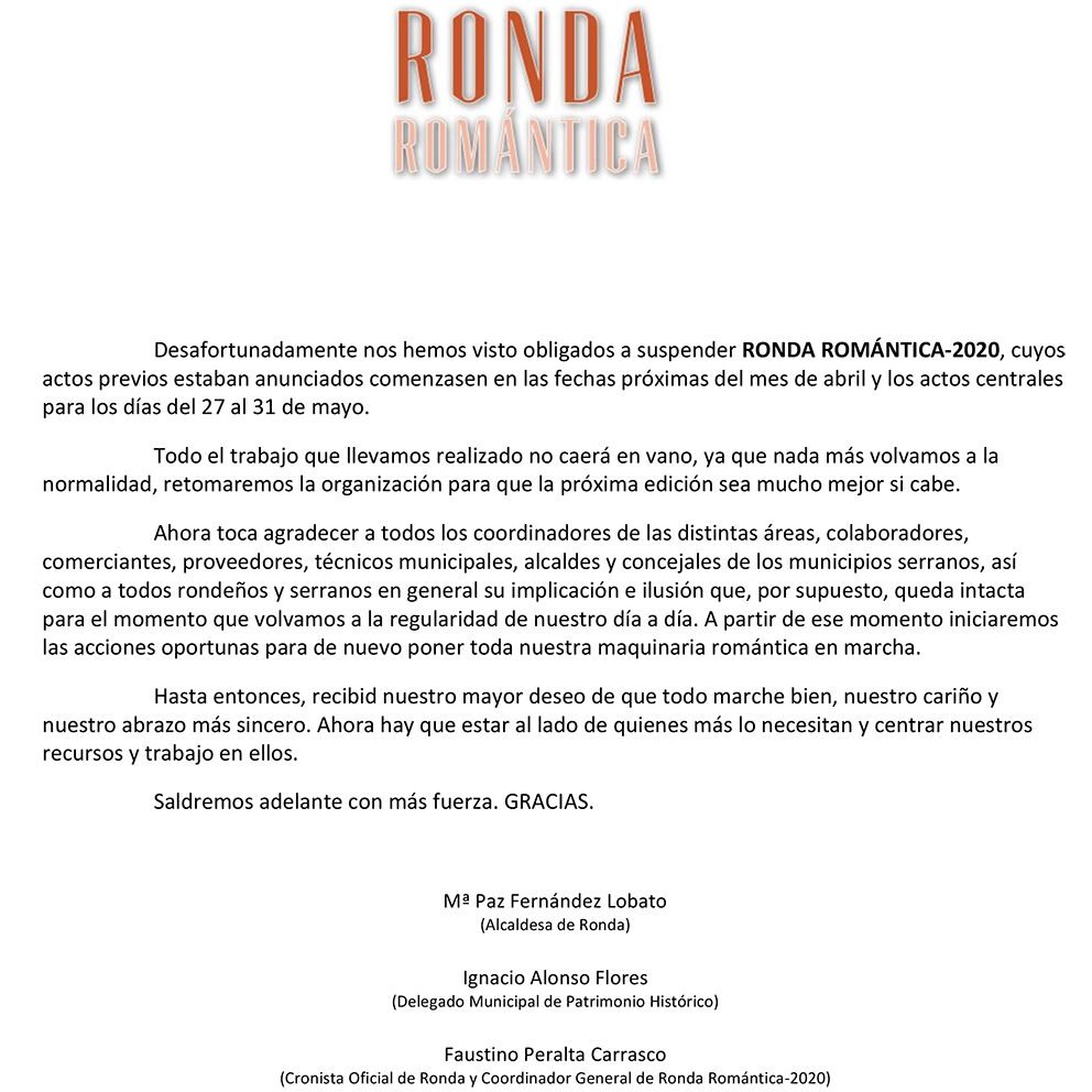 Para la organización de RONDA ROMÁNTICA-2016 se hizo un análisis profundo sobre la situación de la Fiesta, con la finalidad de renovar la apuesta por este gran evento anual. A través de este Libro Blanco se propusieron nuevas acciones y una dedicatoria especial al “Paisaje Romántico Rondeño”.